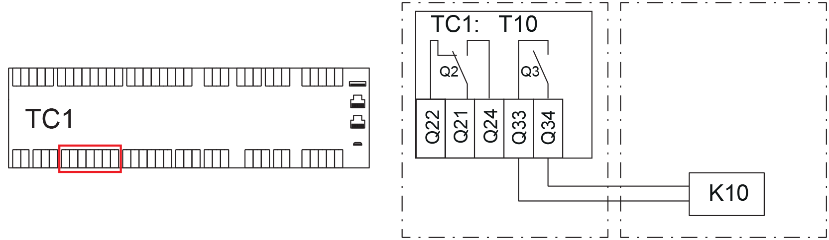 Alarm ciągły (K10) należy podłączyć do bezpotencjałowego przekaźnika Q3 sterownika TC1, jak pokazano na rysunku. Należy użyć 2-żyłowego kabla o przekroju co najmniej 0,5 mm2.