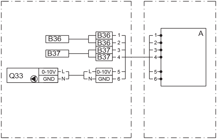 Obwód przegrzewacza ma czujniki wody zasilającej i powrotnej oraz regulowaną pompę cyrkulacyjną. Czujniki (B36 i B37) i układ regulacji pompy (0–10 V) podłączyć do systemu automatyki wyższego poziomu, jak pokazano na rysunku.